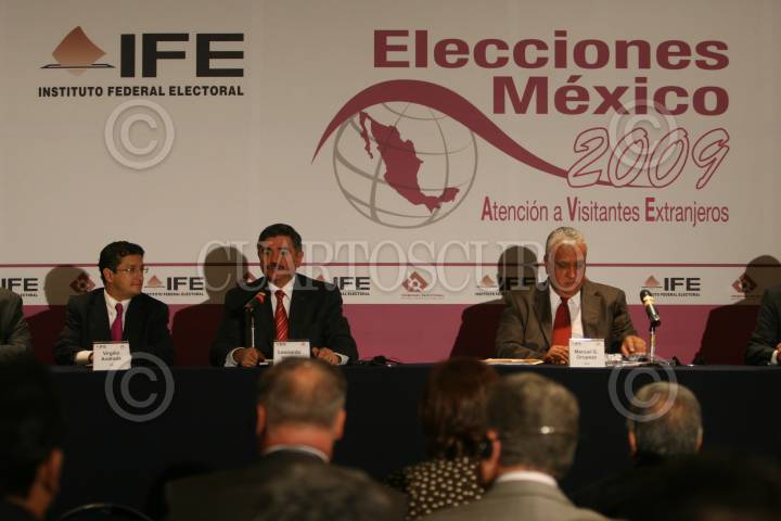MÉXICO, D.F., 02JULIO2009.- El consejero electoral Virgilio Andrade , el presidente consejero del IFE Leonardo Valdez, y Manuel G Oropeza del Tribunal Electoral del Poder Judicial de la Federación durante el Foro Elecciones México "Atención a visitantes extranjeros " que se realizo en un hotel de la ciudad de México. FOTO: RICARDO CASTELAN/CUARTOSCURO.COM