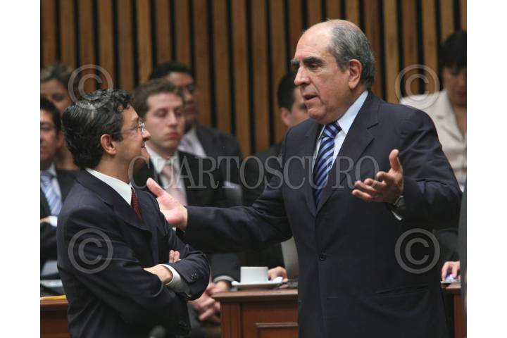 MÉXICO, D.F., 03JUNIO2010.- El consejero Virgilio Andrade conversa con Pablo Gomez durante la sesión extraordinaria del Consejo General del Instituto Federal Electoral. FOTO: CUARTOSCURO.COM