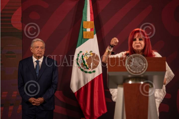 El presidente de la República, Andres Manuel López Obrador, durante la conferencia matutina diaria. El mandatario estuvo acompañado por Layda Sansores San Román, gobernadora de Campeche.
