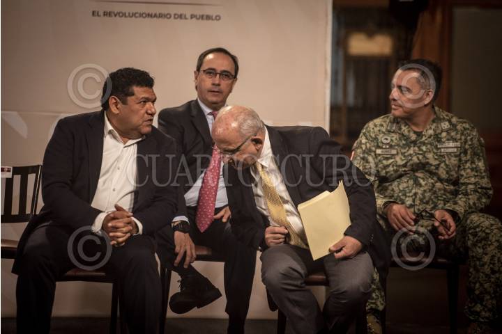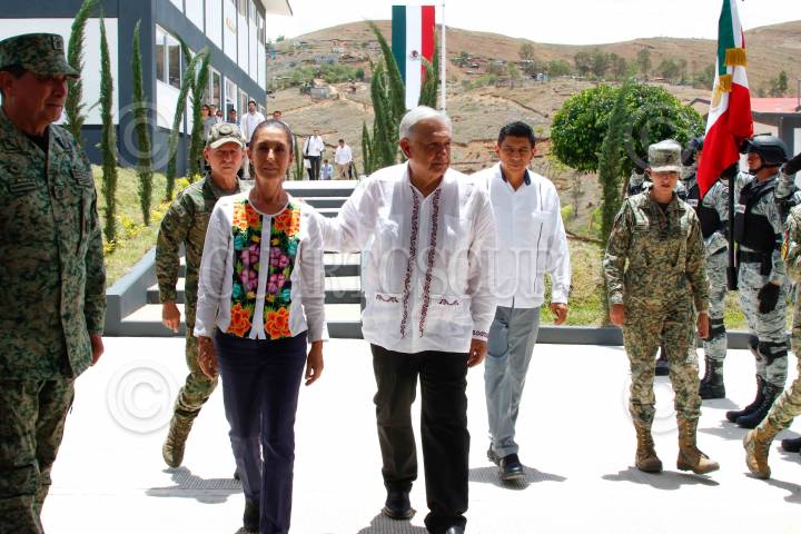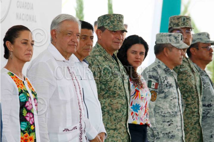 SANTA CRUZ XOXOCOTLÁN, OAXACA, 22JUNIO2024.- Claudia Sheinbaum, Presidenta Electa de México; Andrés Manuel López Obrador, Presidente de México; Salvador Jara, gobernador de Oaxaca; Luis Cresencio Sandoval, secretario de la Defensa, y Luisa María Alcalde Luján, secretaria de Gobernación, durante la Inauguración de instalaciones de la Guardia Nacional en Santa Cruz Xoxocotlán. FOTO: PRESIDENCIA /CUARTOSCURO.COM