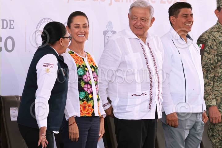 SANTA CRUZ XOXOCOTLÁN, OAXACA, 22JUNIO2024.- Rosa Icela Rodríguez, secretaria de Seguridad y Protección Ciudadana (SSyPC); Claudia Sheinbaum, Presidenta Electa de México; Andrés Manuel López Obrador, presidente Constitucional de los Estados Unidos Mexicanos, y Salvador Jara, gobernador de Oaxaca, durante la inauguración de instalaciones de la Guardia Nacional en Santa Cruz Xoxocotlán. FOTO: PRESIDENCIA/CUARTOSCURO.COM