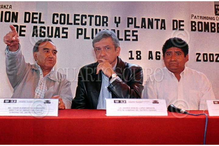 Cesar Buen Rostro, secretario de obras públicas, Andrés Manuel López Obrador, jefe de gobierno capitalino y Juan Gonzalez Romero, delegado de Xochimilco durante la inauguración del colector y planta de bombeo de aguas pluviales en esta demarcación. FOTO: Susana Navarrete/CUARTOSCURO.COM