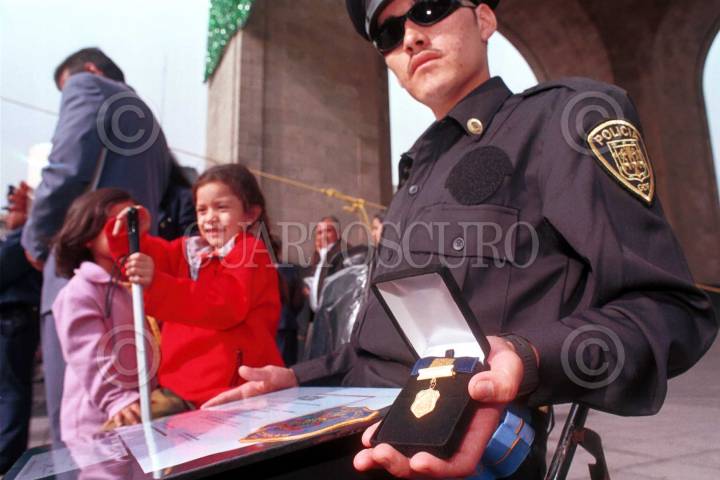 El policía auxiliar Alejandro Felgado Herrera fue condecorado esta mañana por su labor al servicio de la ciudadania luego de recibir un disparo en la cabeza al intentar frustrar un asalto, evento por el cual permaneció un mes y medio en estado de coma. FOTO: Oswaldo Ramirez/CUARTOSCURO.COM
