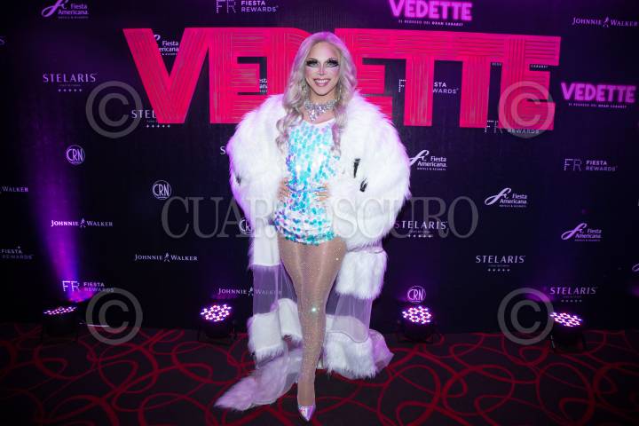 Fifí Estah a su paso por la alfombra roja del espectáculo de cabaret “Vedette”, que se presentará en el Hotel Fiesta Americana de la Ciudad de México.