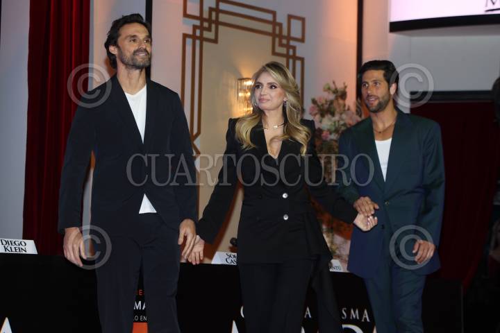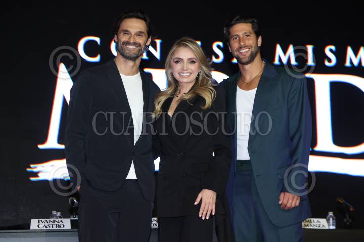 CIUDAD DE MÉXICO, 11MARZO2025. Iván Sánchez, Angélica Rivera y Diego Klein durante la presentación de la serie “Con esa misma mirada”, producción que próximamente podrá ser vista en la plataforma de ViX. FOTO: EDGAR NEGRETE LIRA/CUARTOSCURO.COM