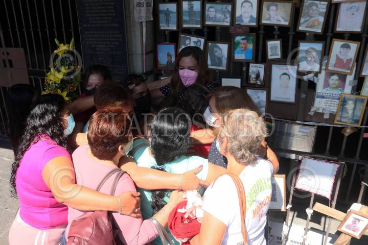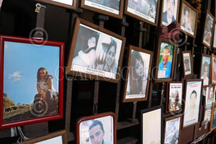 Conmemoran el noveno aniversario de la desaparición de la joven Viridiana Morales Rodríguez, en la imagen su retrato con marco rojo, junto a decenas de victimas de la violencia en Morelos.