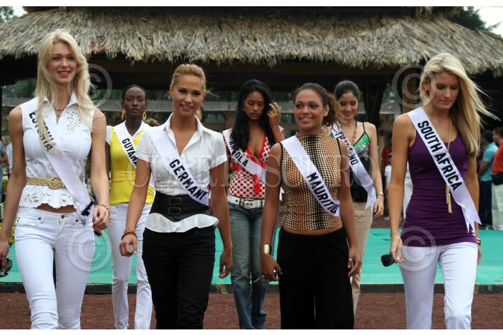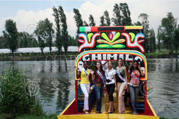 MÉXICO, D.F. 05MAYO2007.- Las participantes de Miss Universo 2007 visitaron Xoxhimilco, las representantes de: Estonia, Victoria Azouskama, Alemania, Angelina Glass, Mauritania, Sandra Fano, Angola, Sudafrica, Megan Coleman, Micaela Reis y Guyana, Meleesa Payne a su llegada. FOTO: PAOLA HIDALGO/CUARTOSCURO.COM