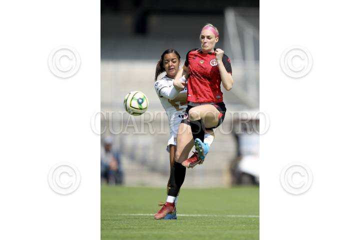 Rebeca Zavaleta de Pumas y Angelina Hix de Xolas disputan una pelota durante partido de fútbol Pumas vs Tijuana correspondiente a la jornada 6 del Torneo Clausura 2023 de Liga BBVA MX Femenil, en el Estadio Olímpico Universitario.