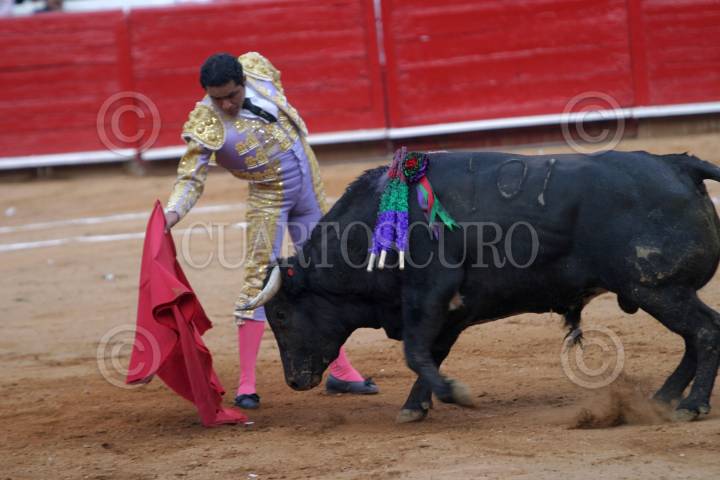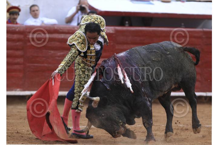 PUEBLA, PUEBLA, 29MAYO2010.- El matador José Luis Angelino, obtuvo una oreja cuando bordó al ejemplar Gran Amigo, de la ganadería Reyes Huerta, en la faena realizada en memoria del empresario Gabriel Huerta Ortega que se realizo la noche de ayer en la plaza de toros El Relicario. FOTO: FRANCISCO GUASCO/CUARTOSCURO.COM
