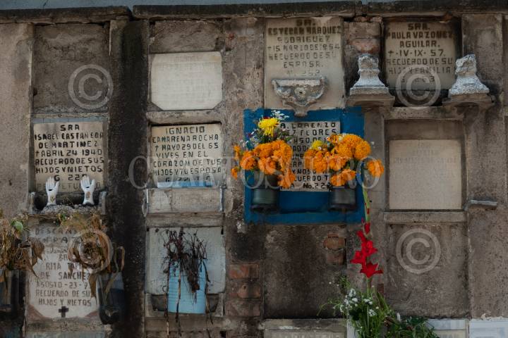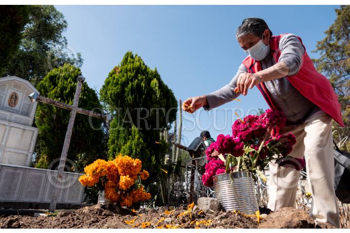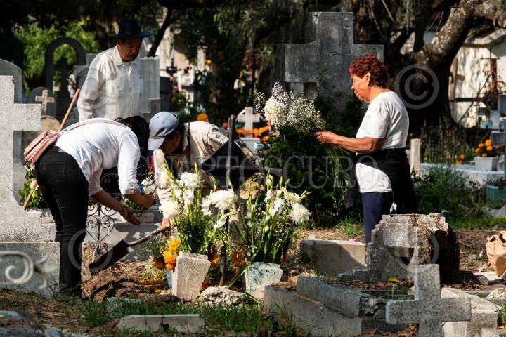 Ofelia Martínez (80) arregla la tumba de su tía, quién cuido de ella y su hermana cuando falleció su madre, esto en el panteón Sanctorum, alcaldía Miguel Hidalgo,