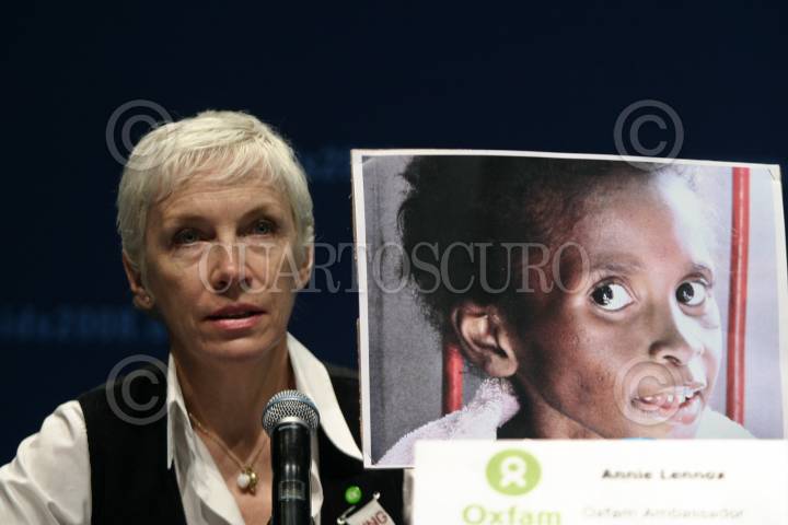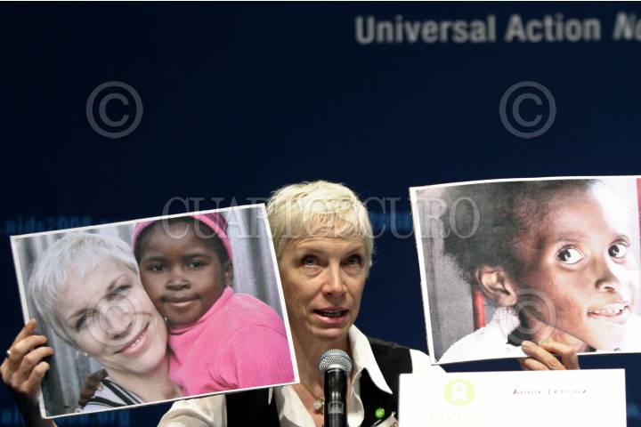 MÉXICO, D.F., 04AGOSTO2008.- La cantante británica Annie Lenox embajadora global de Oxfam muestra una fotografía durante una rueda de prensa en la que pidió acceso universal a tratamiento contra el VIH/SIDA. FOTO: RODOLFO ANGULO/CUARTOSCURO.COM