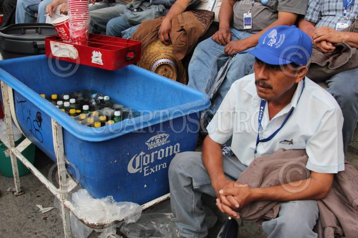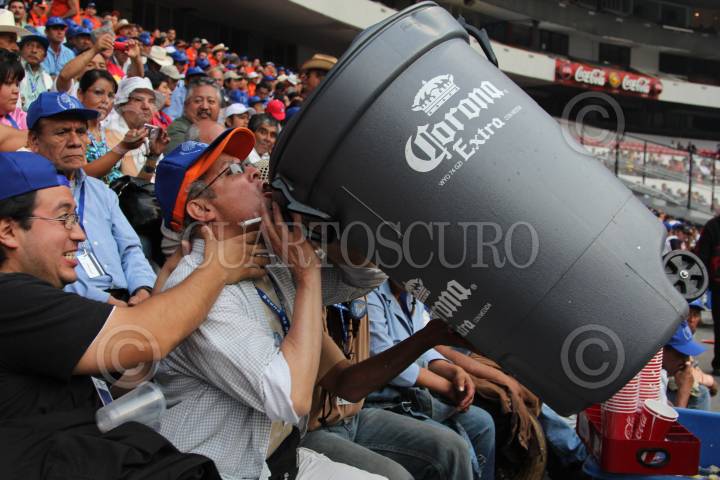 MÉXICO, D.F., 25MARZO2011.- Algunas personas realizaron bromas con botes de basura que tenían la marca de bebidas alcohólicas en el estadio Azteca como parte de la décima convención de alcohólicos anónimos. FOTO: ENRIQUE ORDÓÑEZ/CUARTOSCURO.COM