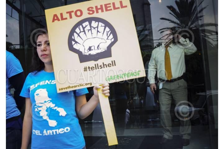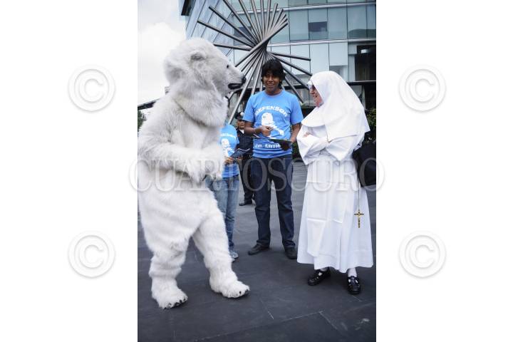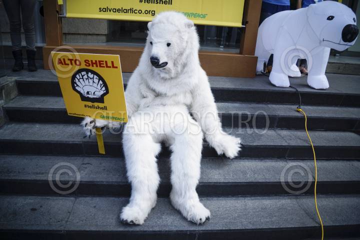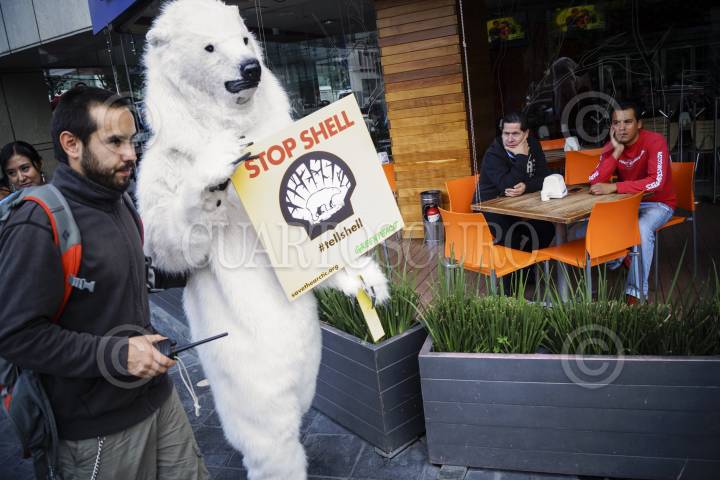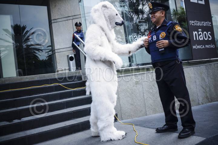 MÉXICO, D.F., 17JULIO2012.- Un Oso Polar, acompañado de activistas de Greenpace, acudieron a las oficinas de la empresa holandesa Shell, ubicadas en Paseo de las Palmas No. 425; para manifestarse y exigirle que deje de poner en peligro la vida en el Ártico en su proyecto de búsqueda por más yacimientos petroleros. La actividad formó parte de una semana de protestas a nivel mundial contra la empresa petrolera, en la que voluntarios con disfraces de osos polares, denuncian el envío de barcos de perforación petrolera para que exploren la región de Beaufort, Alaska y los mares de Chukchi. Los manifestantes declararon que "un derrame de petróleo en el Ártico sería catastrófico para la vida silvestre, para las morsas y ballenas. Por esa razón, el Ártico debe ser protegido y declarado un santuario global, en donde este prohibida la extracción de hidrocarburos. FOTO: ADOLFO VLADIMIR /CUARTOSCURO.COM