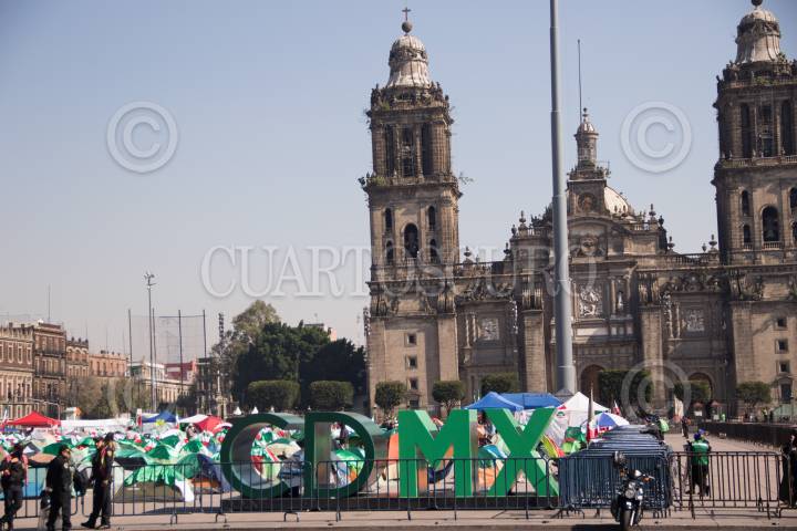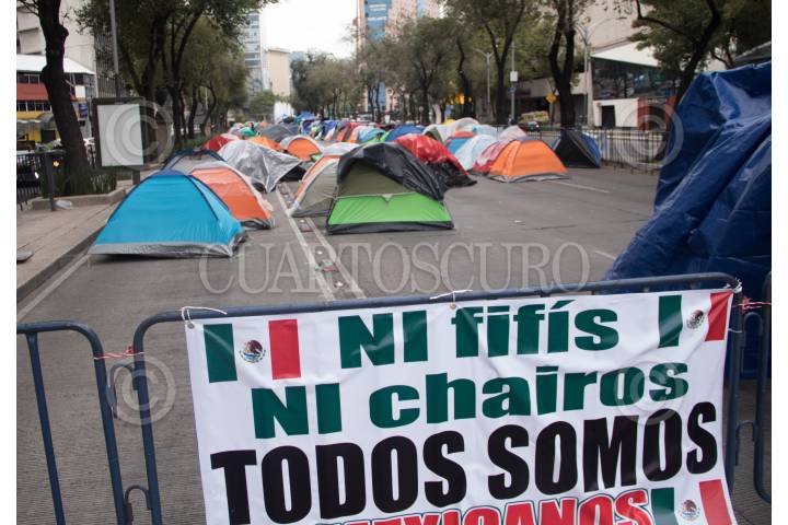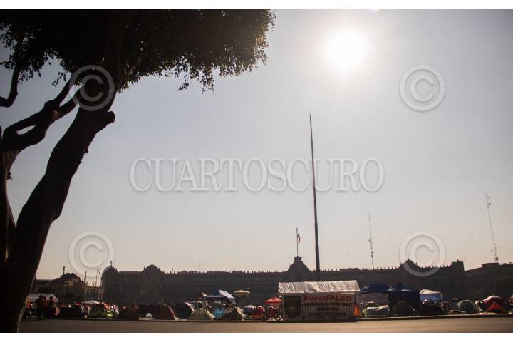 Continúan en plantón el "Campamento México", a quienes el viernes por la noche les fueron retiradas 150 casas de campaña.