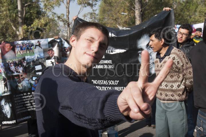 MÉXICO, D.F., 09DICIEMBRE2012.- 56 jóvenes involucrados en las pasadas manifestaciones del primero de diciembre, en contra de Enrique Peña Nieto durante su toma de protesta, fueron liberados esta mañana luego de que se desvanecieron las acusaciones en su contra por delito de ataques a la paz pública. En la foto, el joven que padece el llamado Síndrome de Down, también detenido, hace la "v" de la victoria luego de ser liberado. FOTO: JUAN PABLO ZAMORA /CUARTOSCURO.COM
