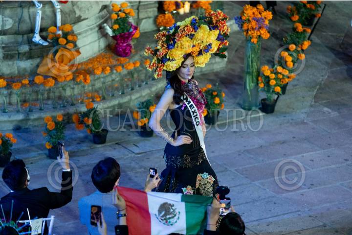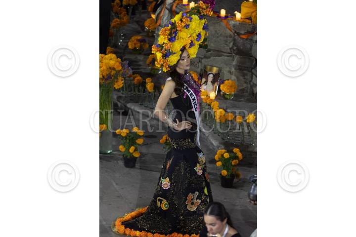 CIUDAD DE MÉXICO, 01NOVIEMBRE2024. La actual Miss Univers Sheynnis Palacios desfila en la “Gala de las Catrinas” con vestido de un diseñador mexicano; evento a beneficencia organizado por Miss Universe, en el Antiguo Colegio de las Vizcaínas. FOTO: EDGAR NEGRETE LIRA/CUARTOSCURO.COM