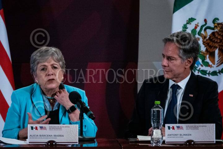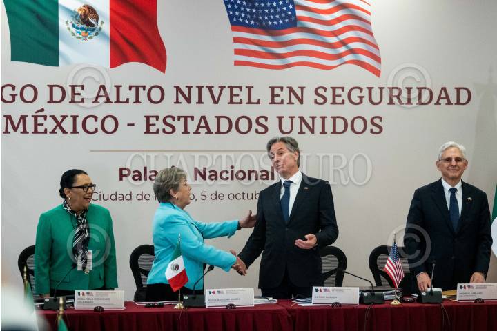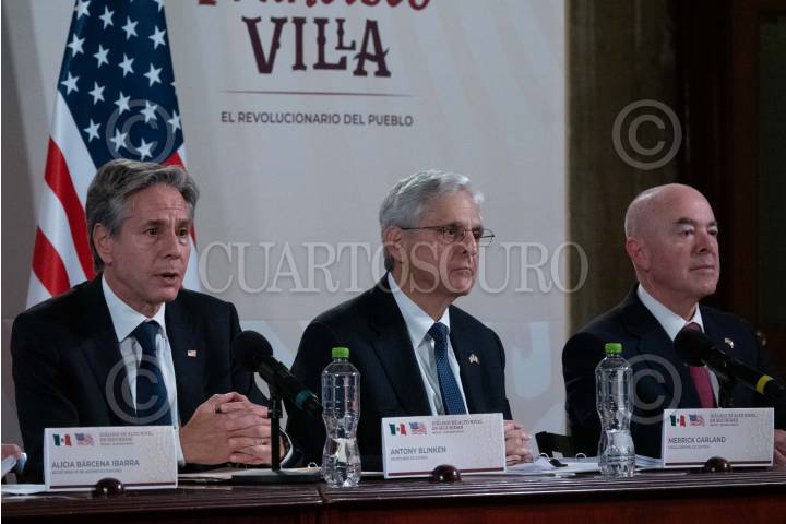 CIUDAD DE MÉXICO, 05OCTUBRE2023.- Rosa Icela Rodríguez, secretaria de Seguridad Pública y Protección Ciudadana; Alicia Bárcena, canciller mexicana; Antony Blinken, Secretario de Estado, y Merrick Garland, Fiscal General de Justicia, durante la reunión con motivo de los “Diálogos de Alto Nivel en Seguridad México-Estados Unidos” a fin de trazar planes en conjunto para el combate al narcotráfico, tráfico de armas y personas. FOTO: GALO CAÑAS/CUARTOSCURO.COM