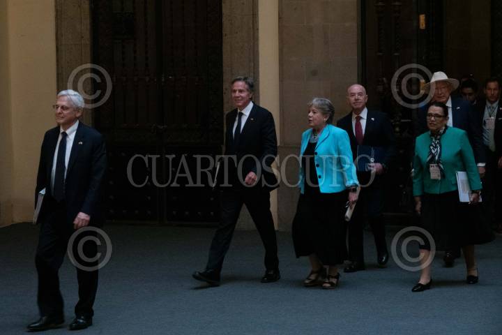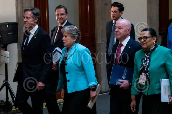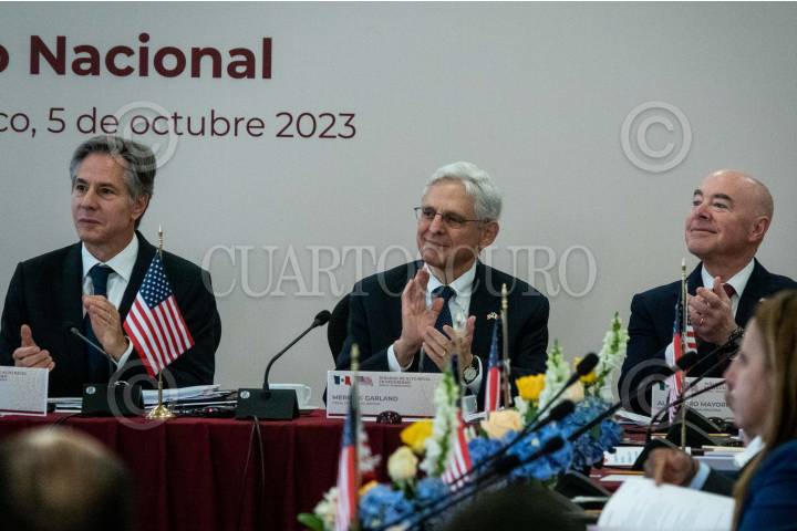 CIUDAD DE MÉXICO, 05OCTUBRE2023.- La comitiva de seguridad de Estados Unidos encabezada por: Antony Blinken, Secretario de Estado; Merrick Garland, Fiscal General de Justicia; Alejandro Mayorkas, Secretario de Seguridad Nacional, y Ken Salazar, embajador en México, y su homóloga mexicana encabezada por: Alicia Bárcena, canciller mexicana; Rosa Icela Rodríguez, secretaria de Seguridad Pública y Protección Ciudadana; Alejandro Gertz Manero, Fiscal General de la República; Luisa María Alcalde , secretaria de Gobernación; Luis Cresencio Sandoval, secretaria de la Defensa Nacional, y Rafael Ojeda, secretario de Marina, encabezaron la reunión con motivo de los “Diálogos de Alto Nivel en Seguridad México-Estados Unidos” a fin de trazar planes en conjunto para el combate al narcotráfico, tráfico de armas y personas. FOTO: GALO CAÑAS/CUARTOSCURO.COM