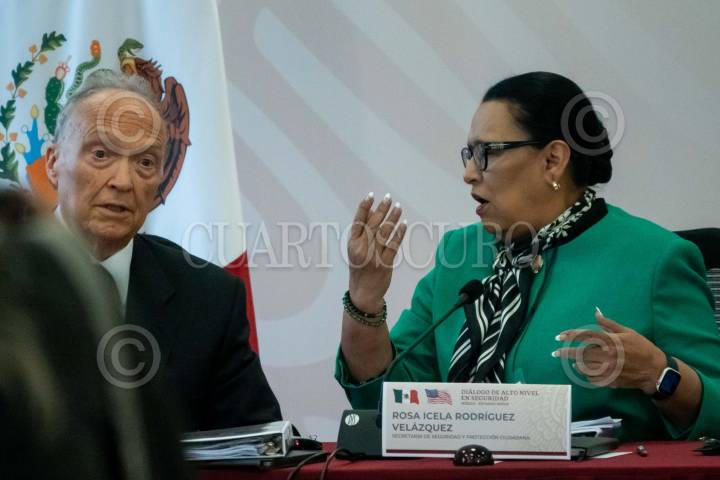 CIUDAD DE MÉXICO, 05OCTUBRE2023.- Alejandro Gertz Manero, Fiscal General de la República, y Rosa Icela Rodríguez, secretaria de Seguridad Pública y Protección Ciudadana, conversan durante la reunión con motivo de los “Diálogos de Alto Nivel en Seguridad México-Estados Unidos” a fin de trazar planes en conjunto para el combate al narcotráfico, tráfico de armas y personas. FOTO: GALO CAÑAS/CUARTOSCURO.COM