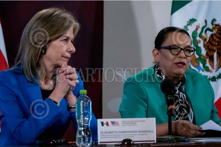 CIUDAD DE MÉXICO, 05OCTUBRE2023.- Elizabeth Sherwood-Randall, asesora del presidente Biden de EE. UU. para Seguridad Nacional, y Rosa Icela Rodríguez, secretaria de Seguridad Pública y Protección Ciudadana de México, durante la conferencia de prensa para dar detalles de los acuerdos y planes trazados en los “Diálogos de Alto Nivel en Seguridad México-Estados Unidos” FOTO: GALO CAÑAS/CUARTOSCURO.COM