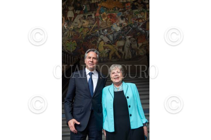 CIUDAD DE MÉXICO, 05OCTUBRE2023.- Antony Blinken, secretario de Estado de los Estados Unidos, y Alicia Bárcena Ibarra, secretaria de Relaciones Exteriores; posan en los murales del Palacio Nacional en el marco del Diálogo de Alto Nivel sobre Seguridad México-Estados Unidos, en donde se trato del tráfico del fentanilo. FOTO: PRESIDENCIA/CUARTOSCURO.COM
