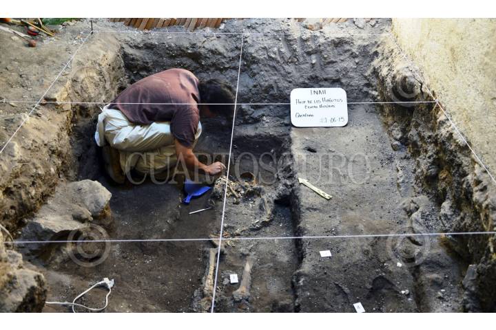 QUERETARO, QUERETARO, 11JUNIO2015.- Tres entierros que datan del periodo virreinal fueron hallados en una antigua edificación del Centro Histórico de la ciudad de Querétaro; en una de las osamentas, se encontró sobre la caja torácica gran cantidad de huesos pequeños que corresponden a un bebé, de lo cual se infiere que se trata de los restos óseos de una mujer con su hijo recién nacido. El edificio donde se registró el hallazgo fue sede del Hospital de San José de Gracia, mejor conocido como el Hospital de los Hipólitos, desde el siglo XVI hasta mediados del XVIII. FOTO: INAH /CUARTOSCURO.COM