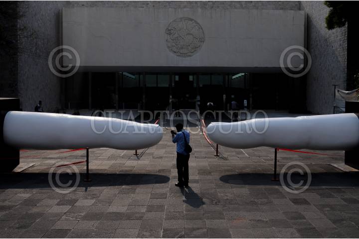 CIUDAD DE MÉXICO, 17ABRIL2024. - Una persona pasa por la escultura "Tú", la cual esta expuesta en la explanada del Museo Nacional de Antropología. FOTO: DANIEL AUGUSTO /CUARTOSCURO.COM