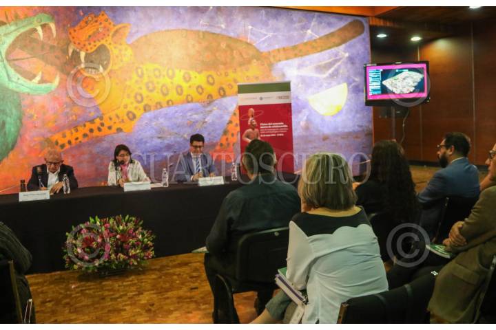 CIUDAD DE MÉXICO, 31OCTUBRE2024.- Diego Prieto, director del INAH y Patricia Ledesma, directora del Museo del Templo Mayor, dialogan durante el evento. FOTO: DANIEL AUGUSTO/ CUARTOSCURO.COM
