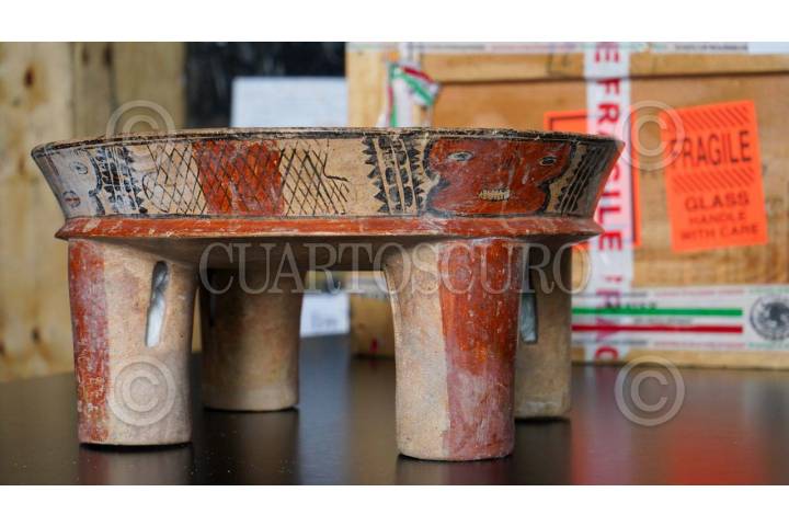 TLAXCALA, TLAXCALA, 17AGOSTO2024.- La Secretaría de Relaciones Exteriores (SRE), a través de la Consultoría Jurídica, entregó al Instituto Nacional de Antropología e Historia (INAH) 279 bienes culturales recuperados por las embajadas de México en Alemania, Argentina, Canadá, España y Reino Unido; así como por los consulados en las ciudades de Boston, Las Vegas, Miami, Nogales, Oxnard, Seattle y Tucson, en Estados Unidos. Dentro de los lotes de piezas restituidas destacan los restos óseos de un infante, los cuales datan de entre los años 800 y 500 a.C. (Montreal); un mortero trípode cuya temporalidad oscila entre los años 2500 a.C., y 1521 d.C. (Alemania); una máscara tallada en jade elaborada en el periodo Clásico mesoamericano (Los Ángeles); una olla de barro creada en el área cultural del Occidente de Mesoamérica entre los años 200 y 800 d.C. (Las Vegas); un cuchillo bifacial procedente del Altiplano Central mexicano (Tucson) y 19 piezas arqueológicas elaboradas en diversos periodos y zonas del actual territorio nacional, que datan del lapso comprendido entre los años 1200 y 1521 d.C. (Reino Unido de la Gran Bretaña e Irlanda del Norte). FOTO: SRE/CUARTOSCURO.COM