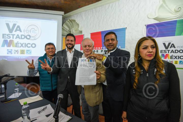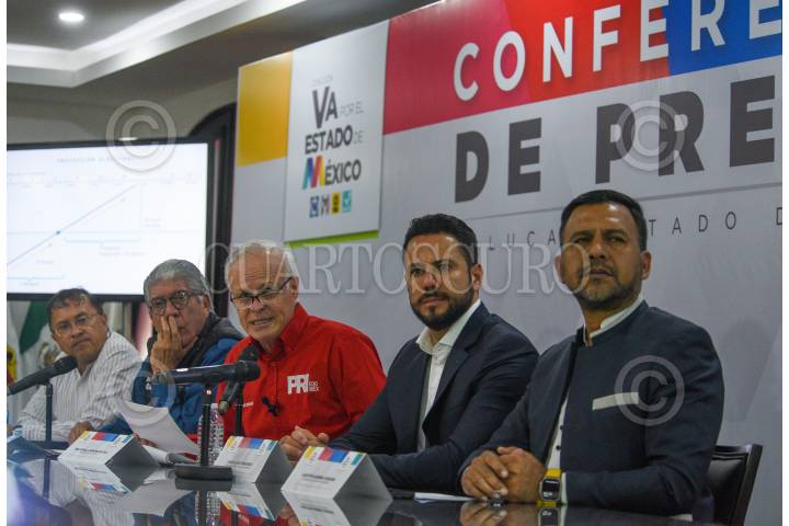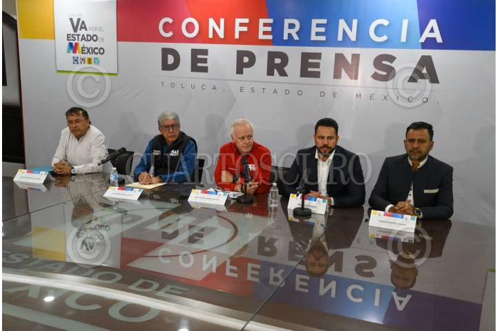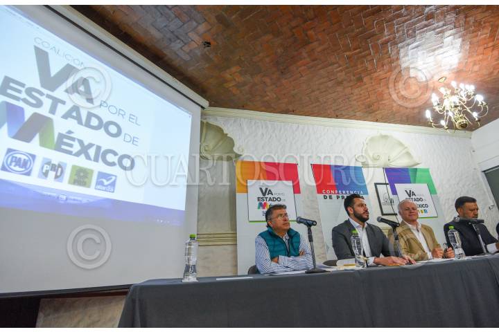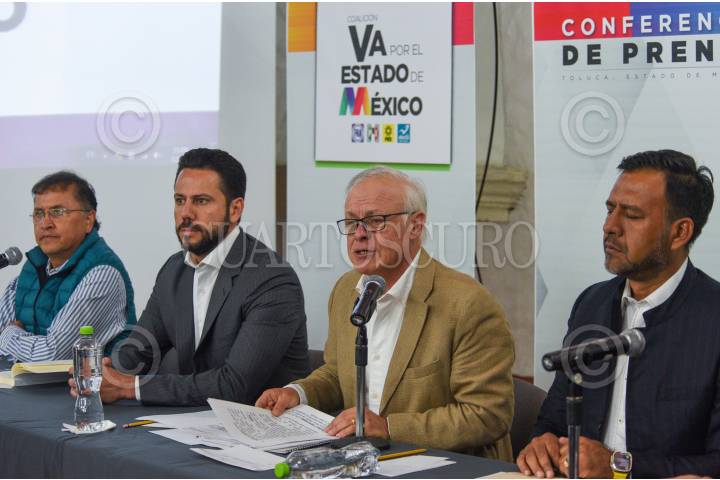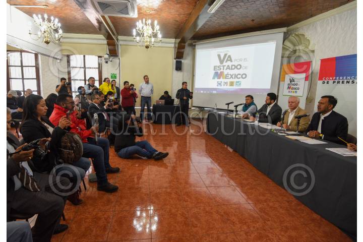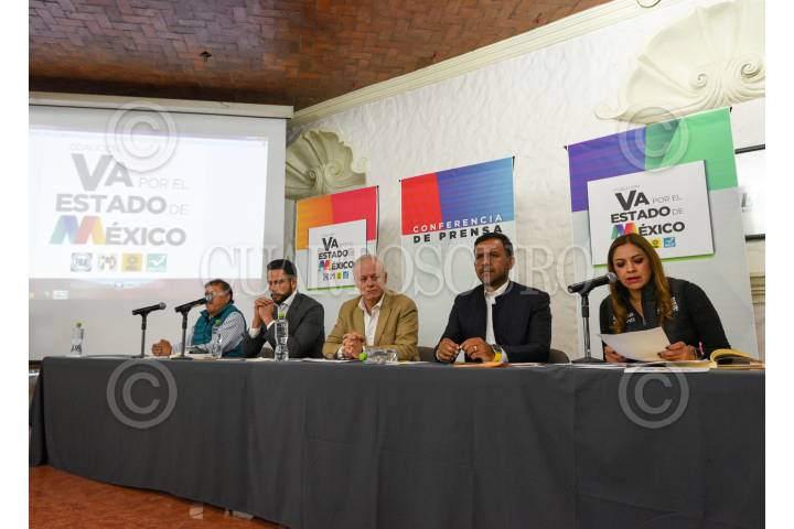 Los presidentes estatales del PRI, PAN, PRD y Nueva Alianza, Erick Sevilla Montes de Oca, Anuar Azar, Agustín Barrera y Mario Cervantes Palomino, integrantes de la Coalición “Va por el Estado de México” ofrecieron conferencia de prensa de manera conjunta.