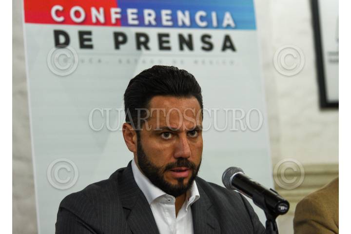 Anuar Azar presidente del PAN en el Estado de México durante la conferencia ofrecida de manera conjunta con los líderes estatales del PRI, PRD y Nueva Alianza.