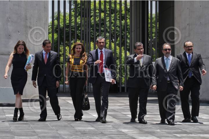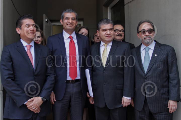 CIUDAD DE MÉXICO, 08AGOSTO2017.- Los líderes partidistas Carlos Alberto Puente Salas, del PVEM, Enrique Ochoa Reza, del PRI, Luis Castro, de Nueva Alianza, así como Miguel Ángel Riquelme, candidato de la alianza por un Coahuila Seguro, acudieron al Tribunal Electoral del Poder Judicial de la Federación, para discutir la posible anulación de la elección en dicho estado. FOTO: ISAAC ESQUIVEL /CUARTOSCURO.COM