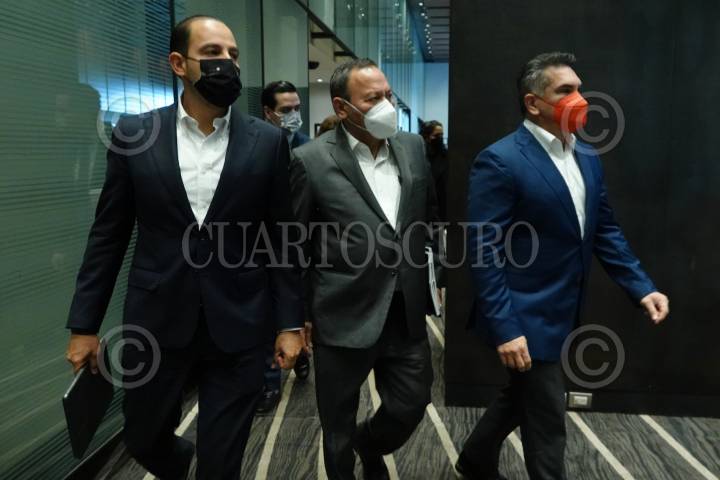 Alejandro Moreno Cárdenas, Marko Cortés y Jesús Zambrano durante la conferencia de prensa de la coalición Va Por México.