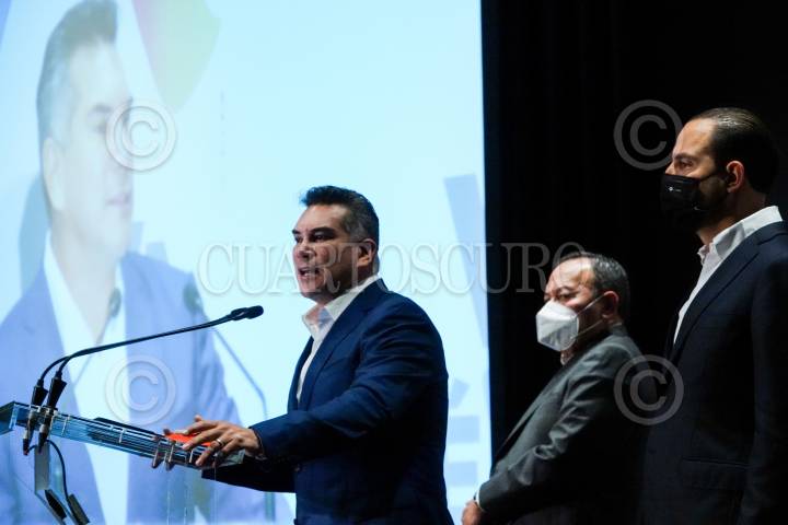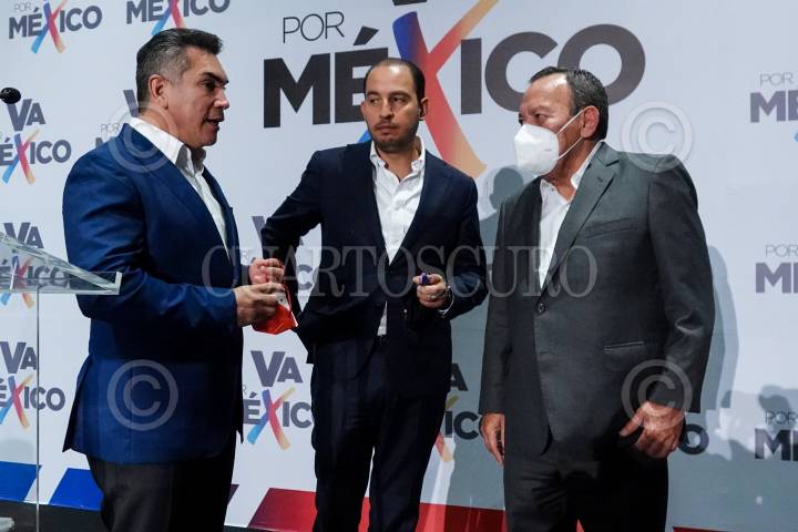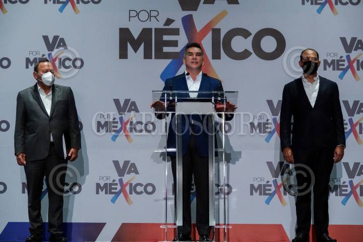 Jesús Zambrano, Alejandro Moreno y Marko Cortés durante la conferencia de prensa de la coalición Va Por México.
