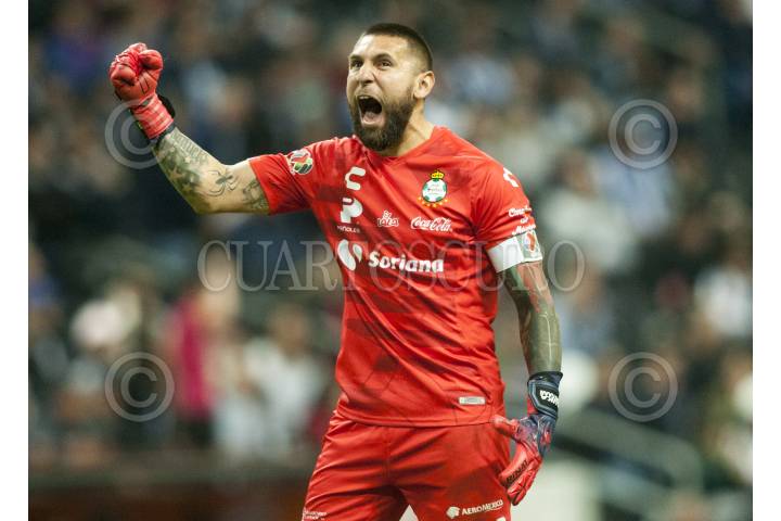 MONTERREY, NUEVO LEÓN, 28NOVIEMBRE2019.- Jonathan Orozco, portero del equipo de Santos, celebra el gol, ante el equipo de los Rayados del Monterrey en el estadio BBVA Bancomer, partido correspondiente a cuartos de final en la Liguilla, Apertura 2019. Marcador Final: Monterrey: 5 - Santos: 2 FOTO: GABRIELA PÉREZ MONTIEL /CUARTOSCURO.COM