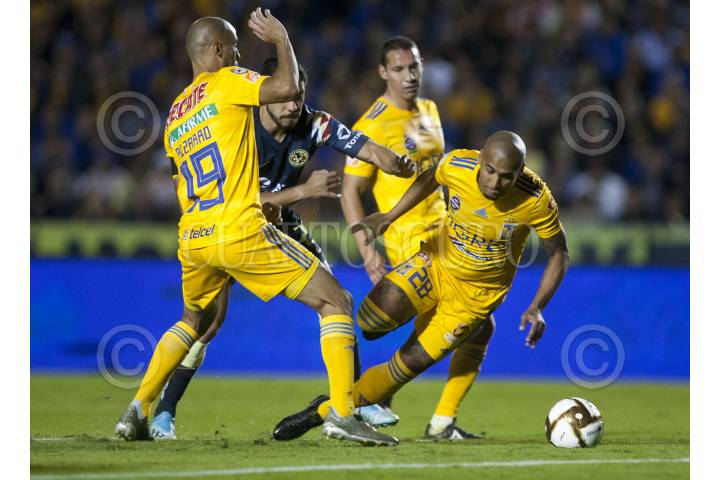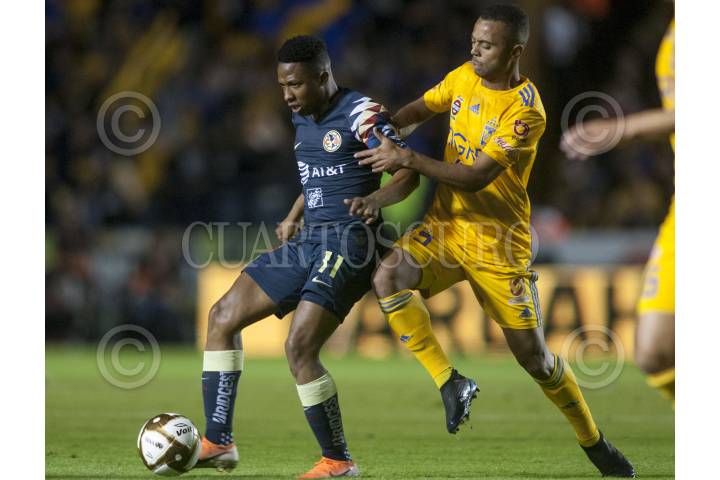 MONTERREY, NUEVO LEÓN, 01DICIEMBRE2019.- Rafael Da Silva del equipo de los Tigres de la UANL, se disputa el balón con Andrés Ibargüen del equipo del América en el estadio Universitario, partido de vuelta en cuartos de final de la Liguilla MX, Apertura 2019. Marcador Final: Tigres: 2 - América: 4 Marcador Global: Tigres: 4 - América: 5 FOTO: GABRIELA PÉREZ MONTIEL /CUARTOSCURO.COM