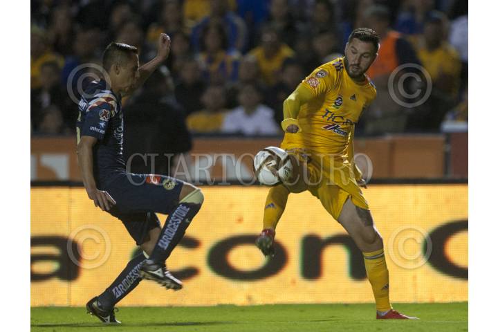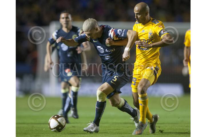 MONTERREY, NUEVO LEÓN, 01DICIEMBRE2019.- Luis Rodríguez del equipo de los Tigres de la UANL, se disputa el balón con Henry Martín del equipo del América en el estadio Universitario, partido de vuelta en cuartos de final de la Liguilla MX, Apertura 2019. Marcador Final: Tigres: 2 - América: 4 Marcador Global: Tigres: 4 - América: 5 FOTO: GABRIELA PÉREZ MONTIEL /CUARTOSCURO.COM