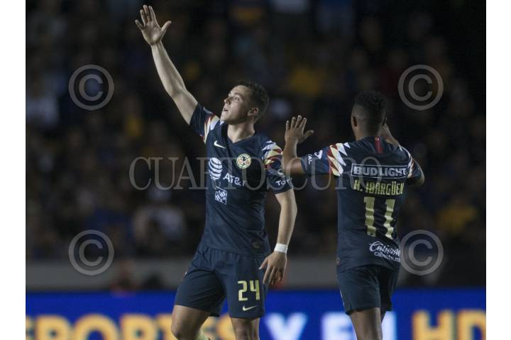 MONTERREY, NUEVO LEÓN, 01DICIEMBRE2019.- Guido Rodríguez del equipo del América, celebra el gol, ante los Tigres de la UANL, en el estadio Universitario, partido de vuelta en cuartos de final de la Liguilla MX, Apertura 2019. Marcador Final: Tigres: 2 - América: 4 Marcador Global: Tigres: 4 - América: 5 FOTO: GABRIELA PÉREZ MONTIEL /CUARTOSCURO.COM
