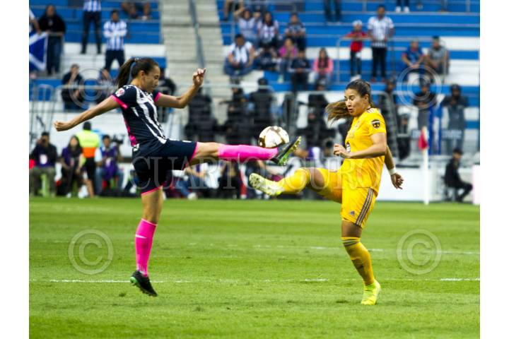 Diana Evangelista del equipo de las Rayadas del Monterrey, se disputa el balón con Lizbeth Ovalle del equipo de Club Tigres Femenil, en el estadio BBVA Bancomer, partido correspondiente a la final de la Liguilla, Apertura 2019. Marcador al medio tiempo: Monterrey: 0 - Tigres Femenil: 0 Marcador Global: Monterrey: 1 - Tigres Femenil: 1 FOTO: GABRIELA PÉREZ MONTIEL /CUARTOSCURO.COM