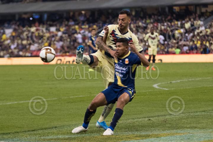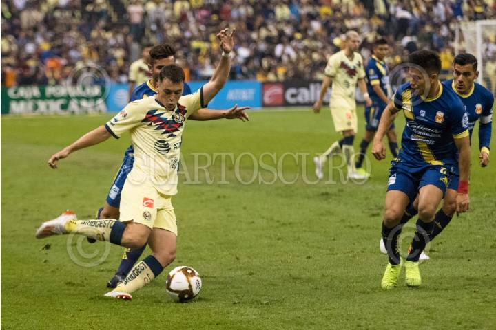 El delantero americanista Federico Viñas dribla a la zaga del Monarca