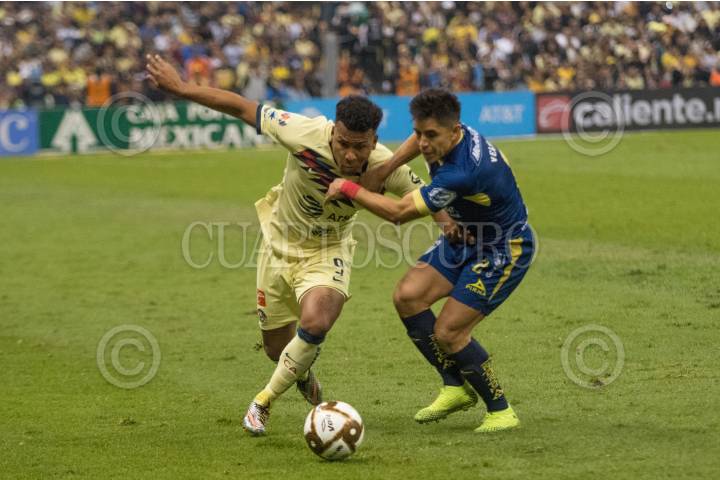 Roger Beyker, delantero de las Águilas, intenta quitarse la marca de Efraín Velarde