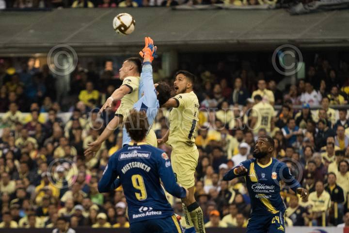Dos jugadores disputan un balón en el área chica del América
