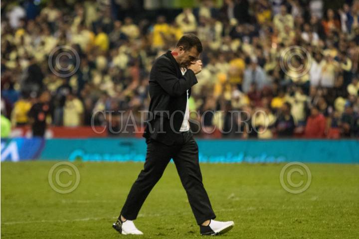 El técnico de Morelia Pablo Adrián Guede sale del campo tras la derrota de su equipo