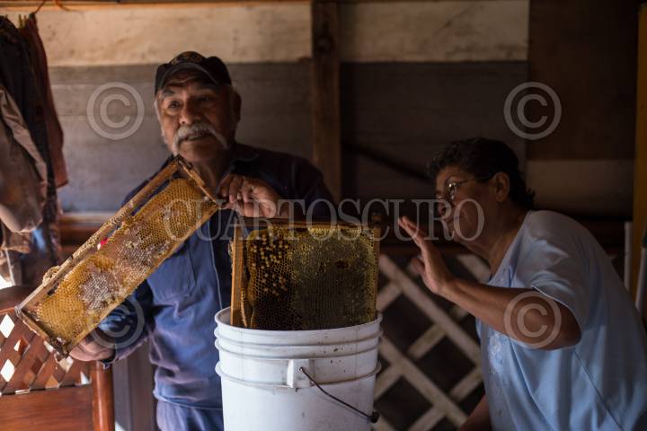 Los apicultores Martha y Juan revisan los bastidores donde las abejas depositan su miel en un apiario en el pueblo de San Andrés Ahuayucán, en la alcaldía Xochimilco