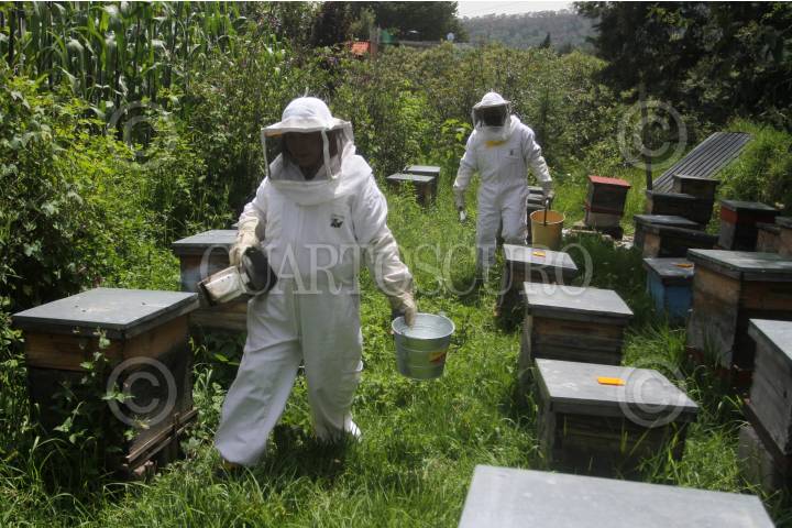 Adriana Veliz, fundadora de Abeja Negra SOS y Luz Millán, trasladaron un enjambre de abejas que se encontraba en un poste en mallas con simuladores de panales para reproducirlas en un Apiario, en el pueblo Santa Cruz Alcapixca, alcaldía Xochimilco