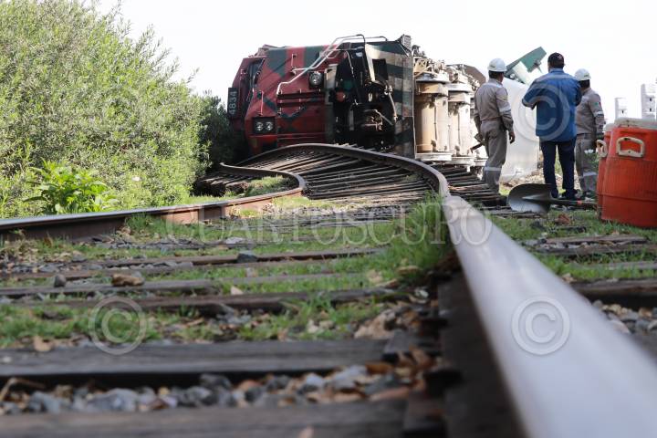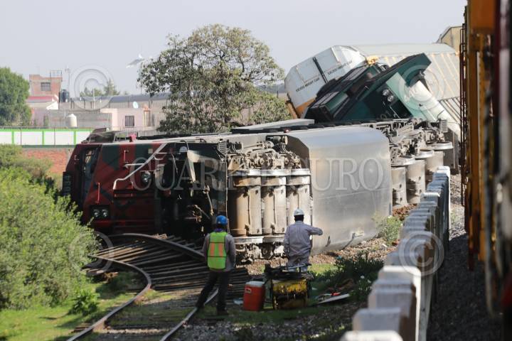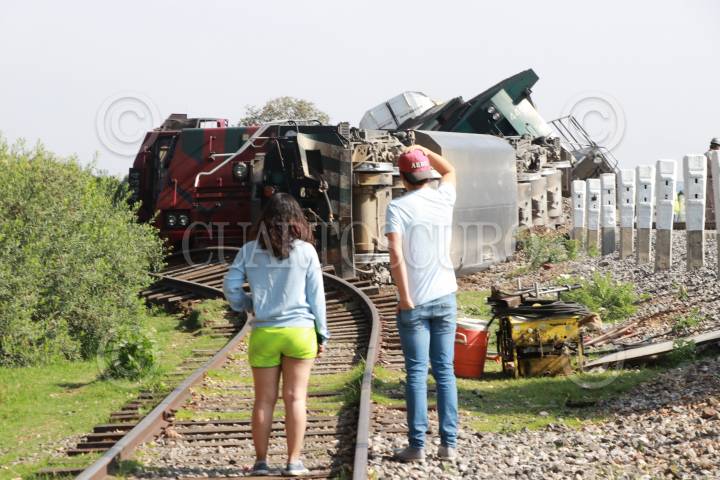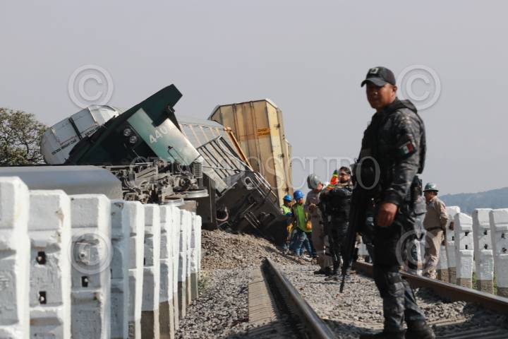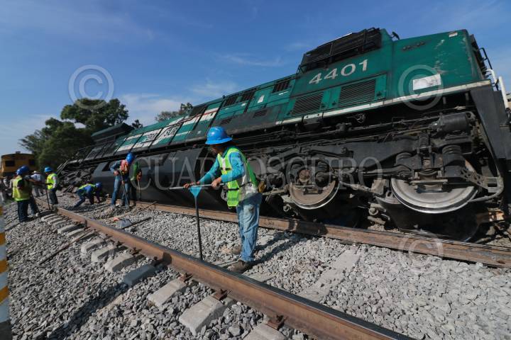 APIZACO, TLAXCALA, 27MAYO2019.- La madrugada del lunes un tren que transportaba vehículos, sufrió un descarrilamiento en las inmediaciones del municipio de Apizaco en el paraje conocido como “La cartonera”. Dos maquinas férreas y un vagón quedaron recostados sobre las vías del tren, durante el percance 2 personas resultaron con lesionadas, así mismo el incidente causó daños materiales y que esa importante vía de comunicación quedará completamente cerrada. Elementos de la Gerdamería y la Policía Estatal implementaron un operativo de vigilancia y seguridad, en espera del personal de Ferrosur e iniciar las maniobras para la liberación de las vías férreas. FOTO: JOAQUÍN SANLUIS /CUARTOSCURO.COM