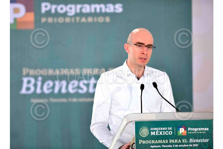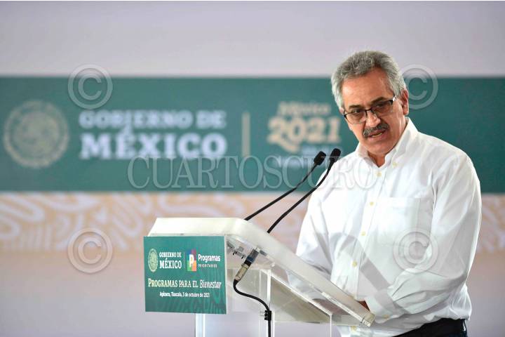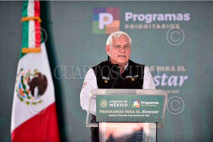 Víctor Manuel Villalobos Arámbula, Secretario de Agricultura y Desarrollo Rural (SADER), durante la presentación de los "Programas para el Bienestar", en Tlaxcala.