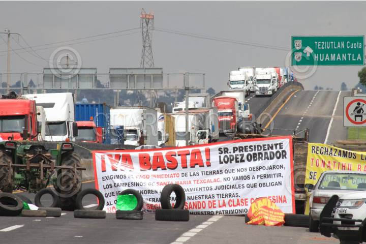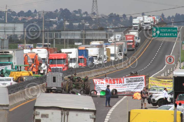 APIZACO, TLAXCALA, 08AGOSTO2024.- Aspecto de la línea de camiones de carga que llevan varados en el sitio por casi 48 horas, esto debido al bloqueo carretero que sostiene un grupo de campesinos y ejidatarios de las comunidades de Santa María Texcalac. Los campesinos decidieron cortar la circulación como una manera de presión para que se les paguen sus tierras, ya que hace años fueron compradas para la construcción de la carretera. Las imágenes fueron realizadas en la importante vía "Libramiento Apizaco-Huamantla" que comunica a estas importantes ciudades con la Ciudad de México y el puerto de Veracruz. FOTO: J. GUADALUPE PÉREZ/CUARTOSCURO.COM