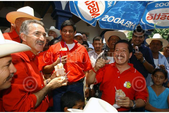 TECULA, NAYARIT 14JUNIO2005.- Roberto Madrazo Pintado Presidente Nacional del PRI y Ney Gonzalez candidato a la gubernatura del Estado de Nayarit, se refrescan con un raspado durante el mitin de campaña de Ney Gonzalez. FOTO: Juan Flores/CUARTOSCURO.COM