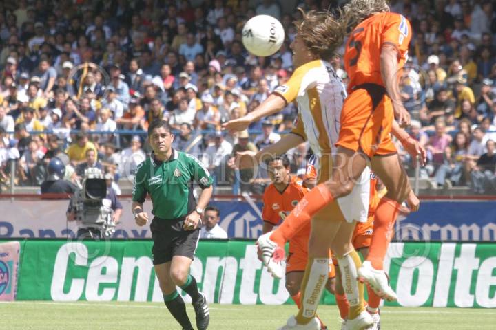 México, D.F., 22FEBRERO2004.- Bruno Marioni, delantero de los Pumas, no pudo con la cerreda defensa de los Jaguares de Chiapas, quienes terminaron imponiendose 1-0, en el partido que disputaron en el estadio Olimpico 68. Al fondo. el arbitro del encuentro Adolfo Aquino Benítez observa las acciones. FOTO: Moisés Pablo/CUARTOSCURO.COM